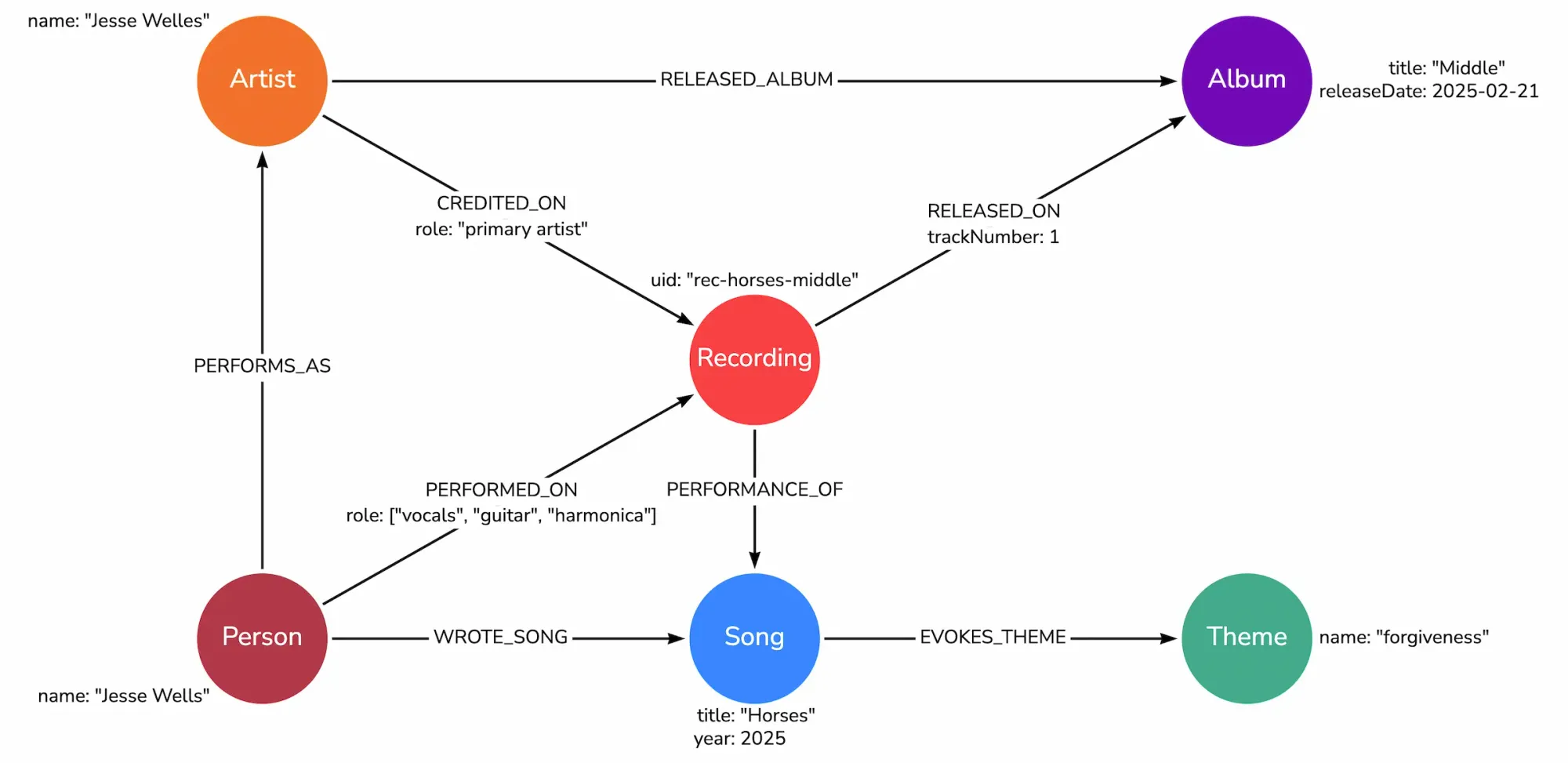 Neo4j is the tool that lets us build, visualize, and query those networks of meaning: whether we're tracing Jesse Welles' creative collaborations, linking lyrics to emotions, or connecting songs to their social contexts.