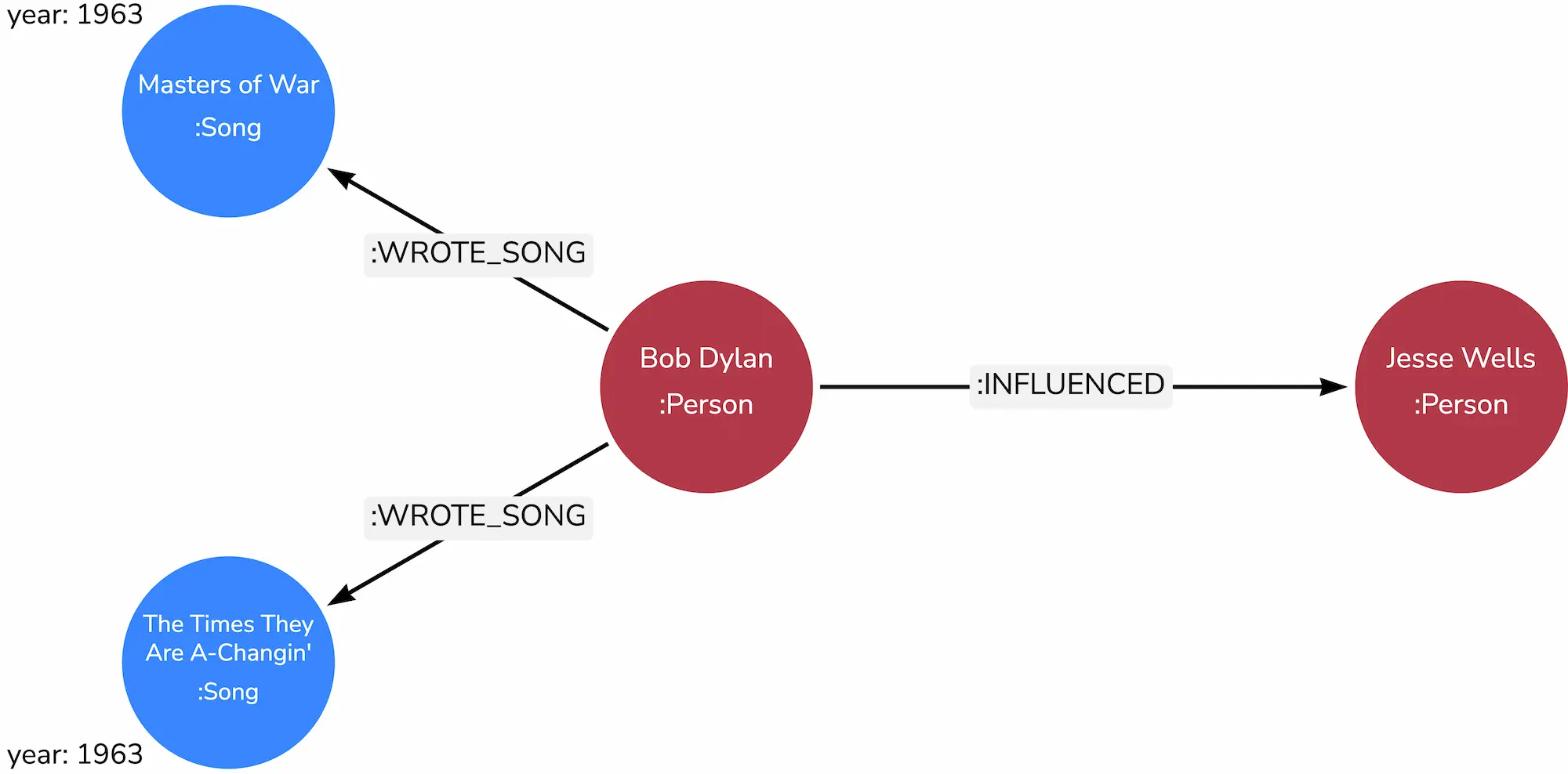 Once you've succeeded in adding these nodes, relationships, and properties to your graph, use the knowledge you've gained in this module to write a Cypher query that returns all people in the database that are influenced by Bob Dylan. Again, don't give up if you find it a bit difficult. The examples on this page give you all the information you need to form this query.